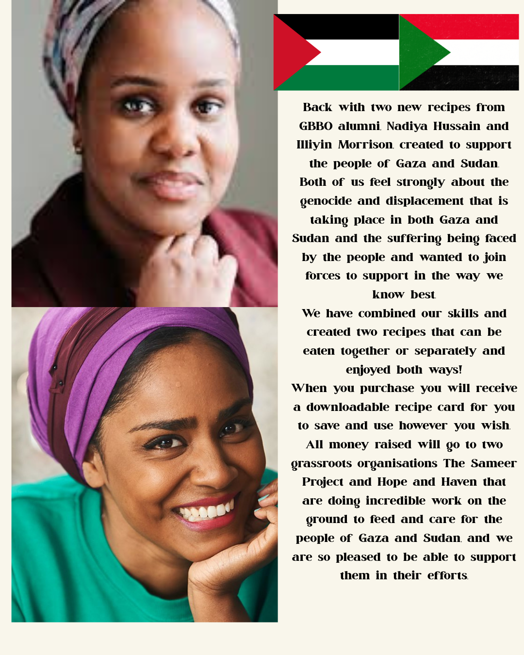 Two recipes from GBBO alumni, Nadiya Hussain and Illiyin Morrison, created to support the people of Gaza and Sudan.